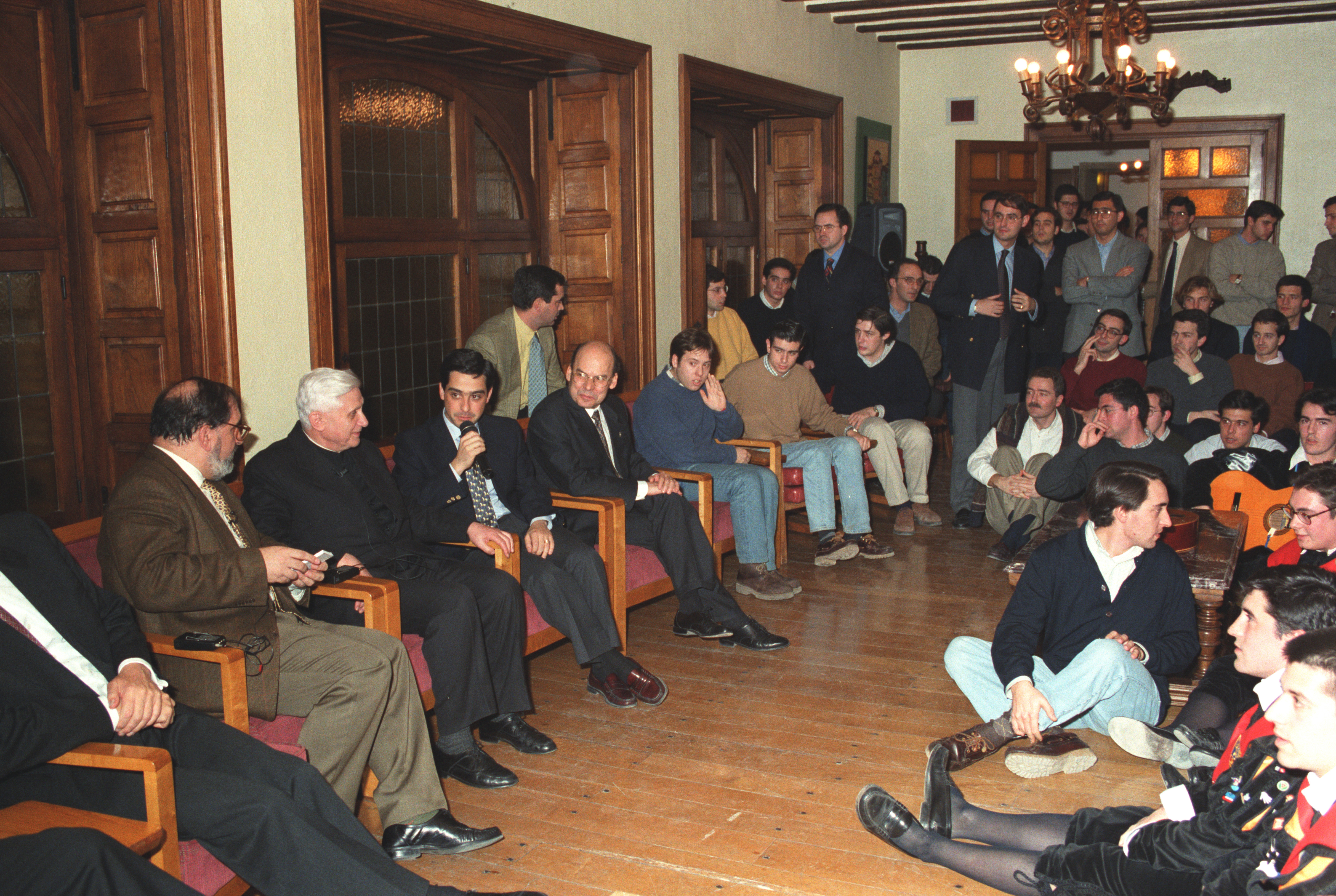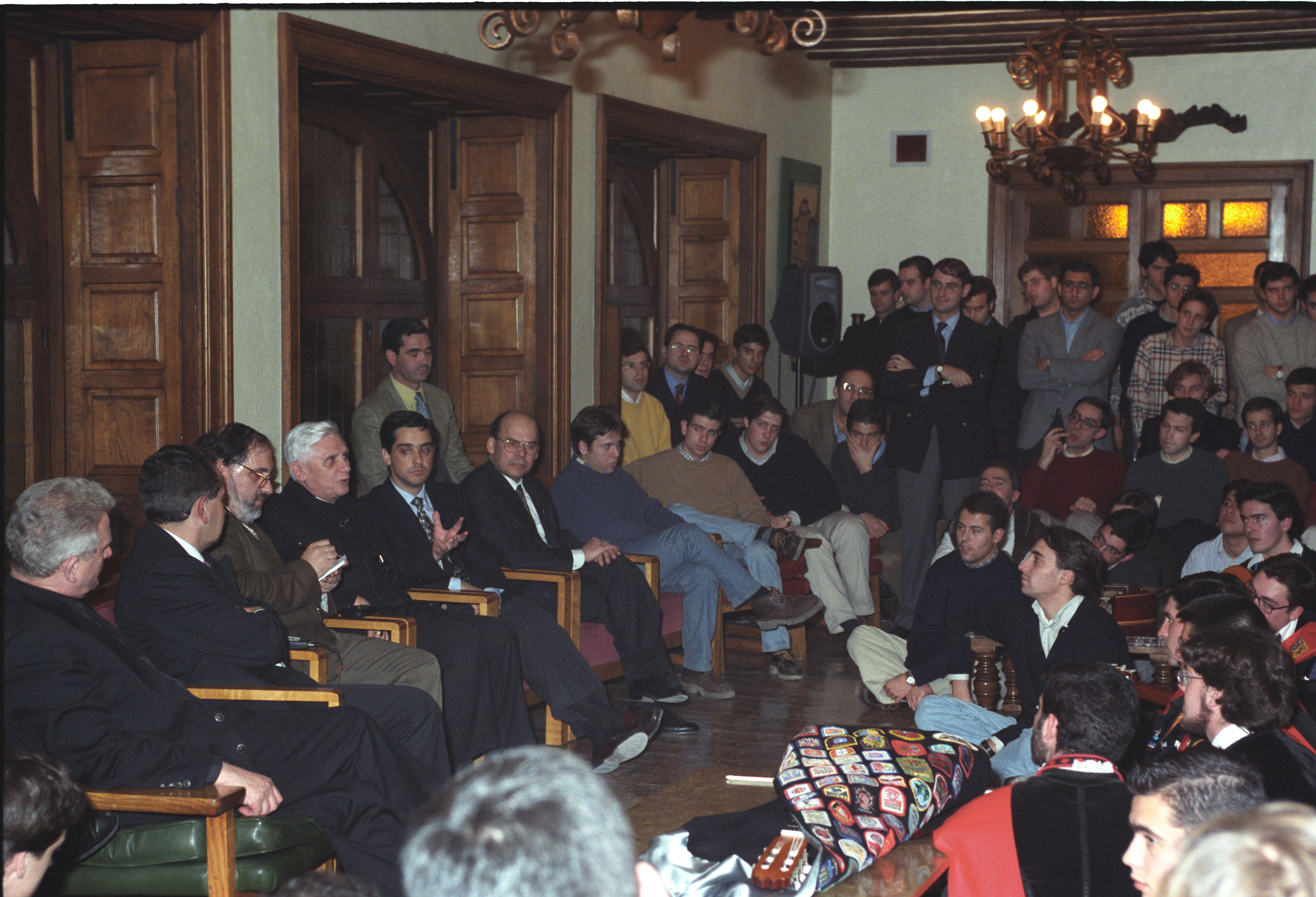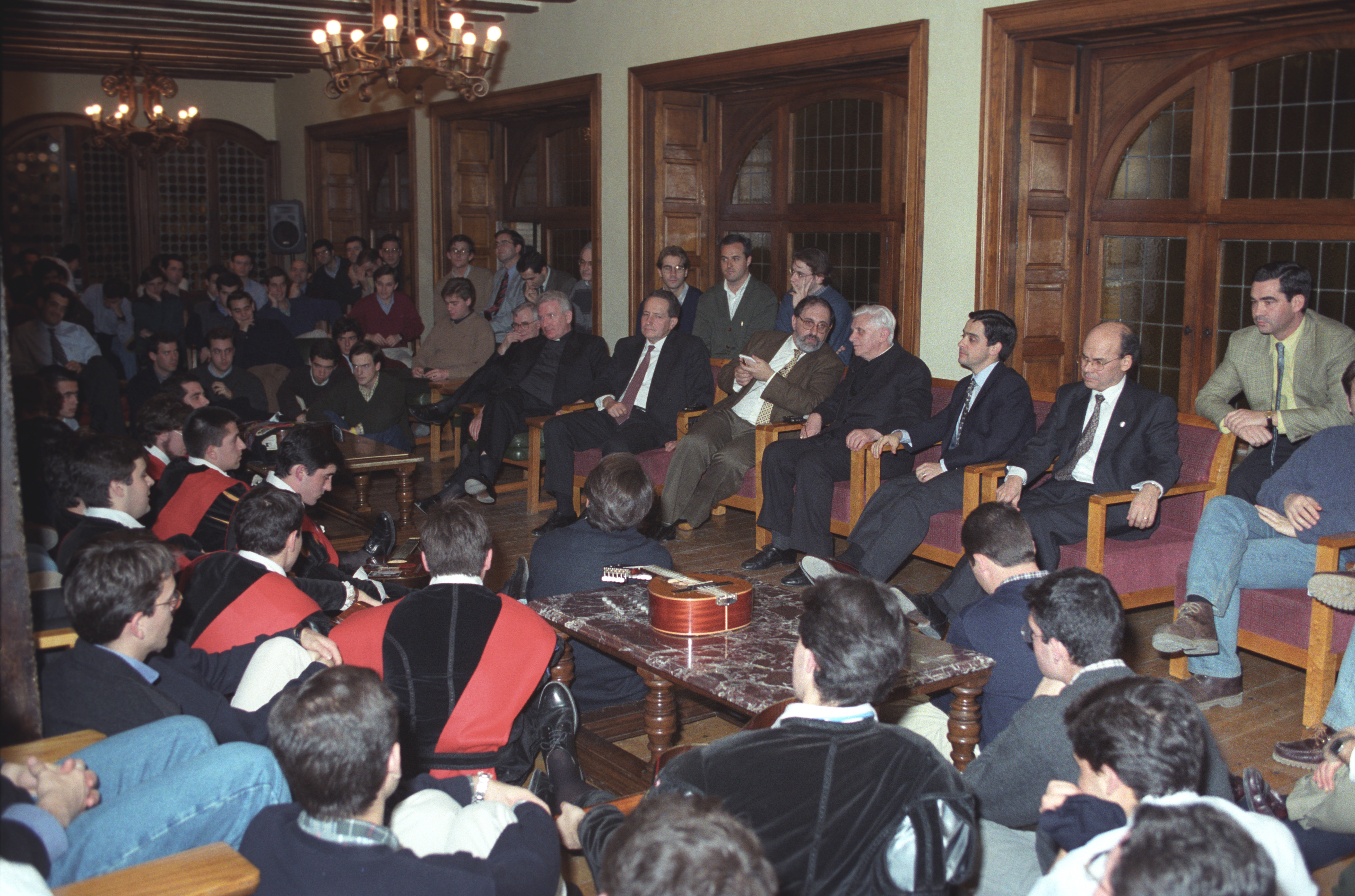 Así se puso de manifiesto la primera noche de su estancia en Pamplona. La tarde del día 40 había llegado cansado del largo viaje desde Roma. El primer ‘encuentro’ de esas jornadas tuvo lugar en el propio Colegio Mayor Belagua, que le hospedaba, con la tuna de la Universidad. “La gentil figura de la tradición”, “con su rumor de capas”, hizo olvidar a Joseph Ratzinger cansancios y retrasos en aeropuertos. Después de cenar, estuvo departiendo distendidamente con residentes en la sala de estar. En principio, después del ajetreo del viaje, iba a ser una sencilla toma de contacto. Las preguntas y las respuestas fueron prolongándose insensiblemente, con esa pérdida del sentido del paso del tiempo que acontece frecuentemente entre los universitarios cuando apasionan los temas de que se está hablando. El lector puede deducirlo de aquel coloquio espontáneo que se transcribe a continuación.