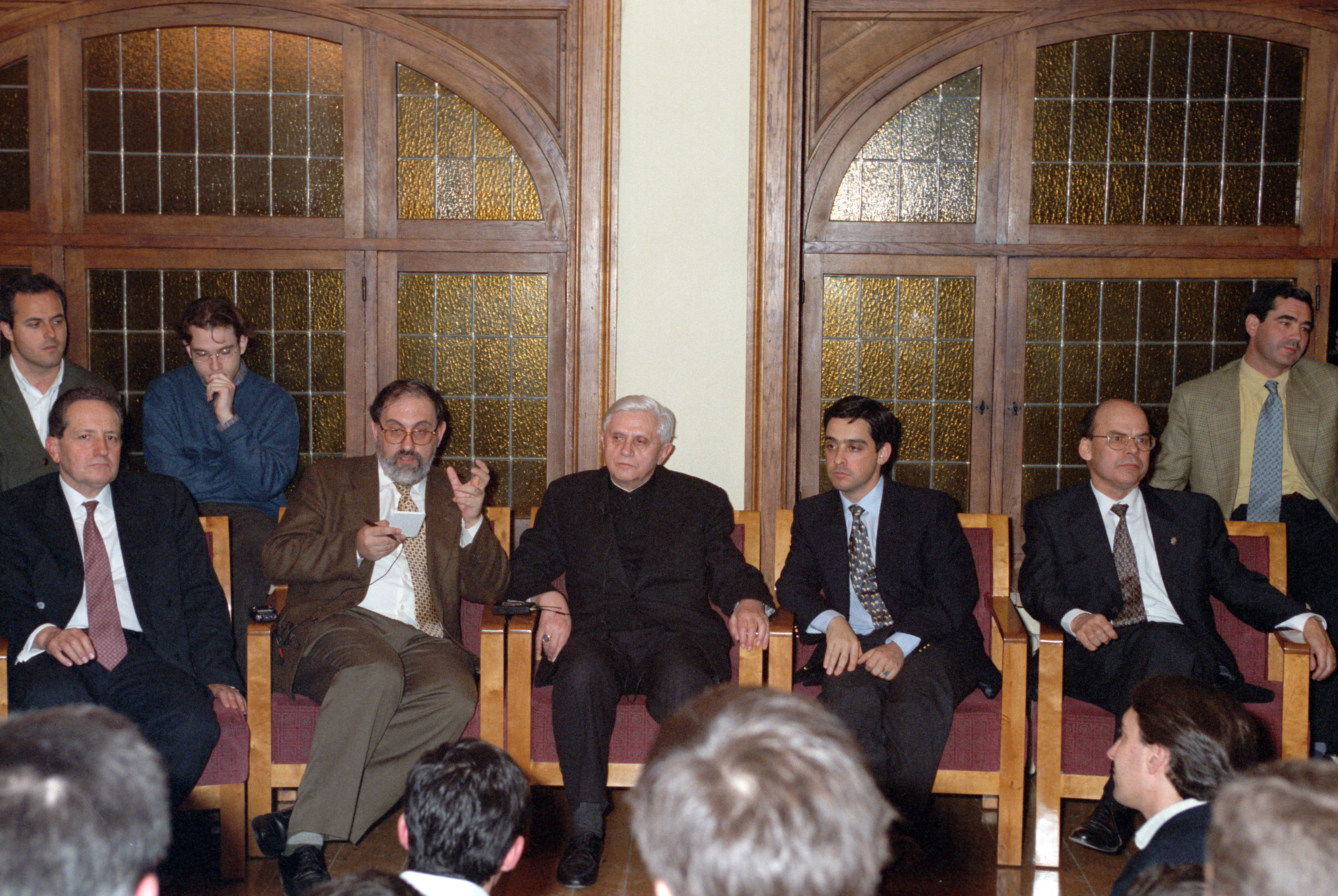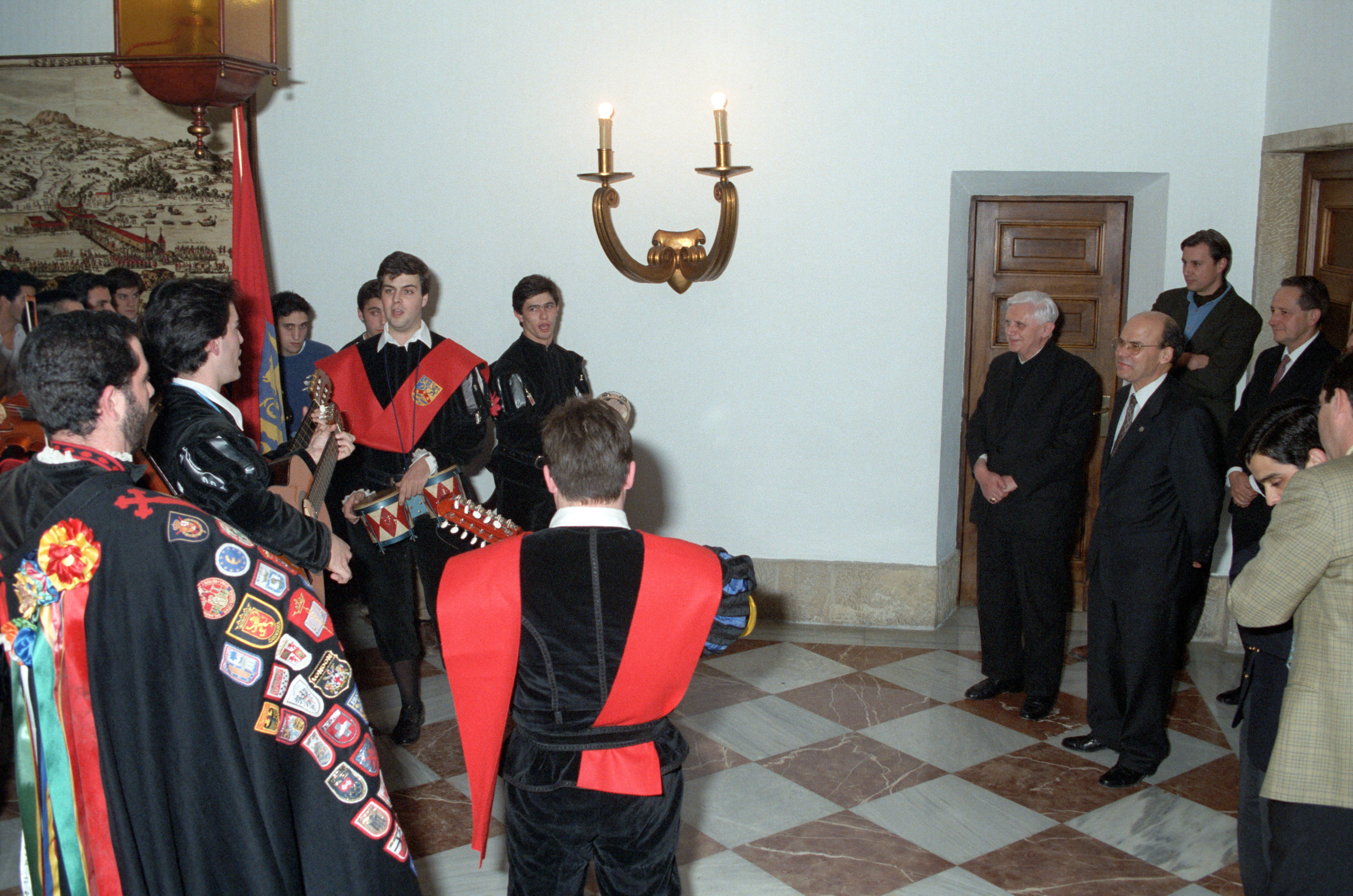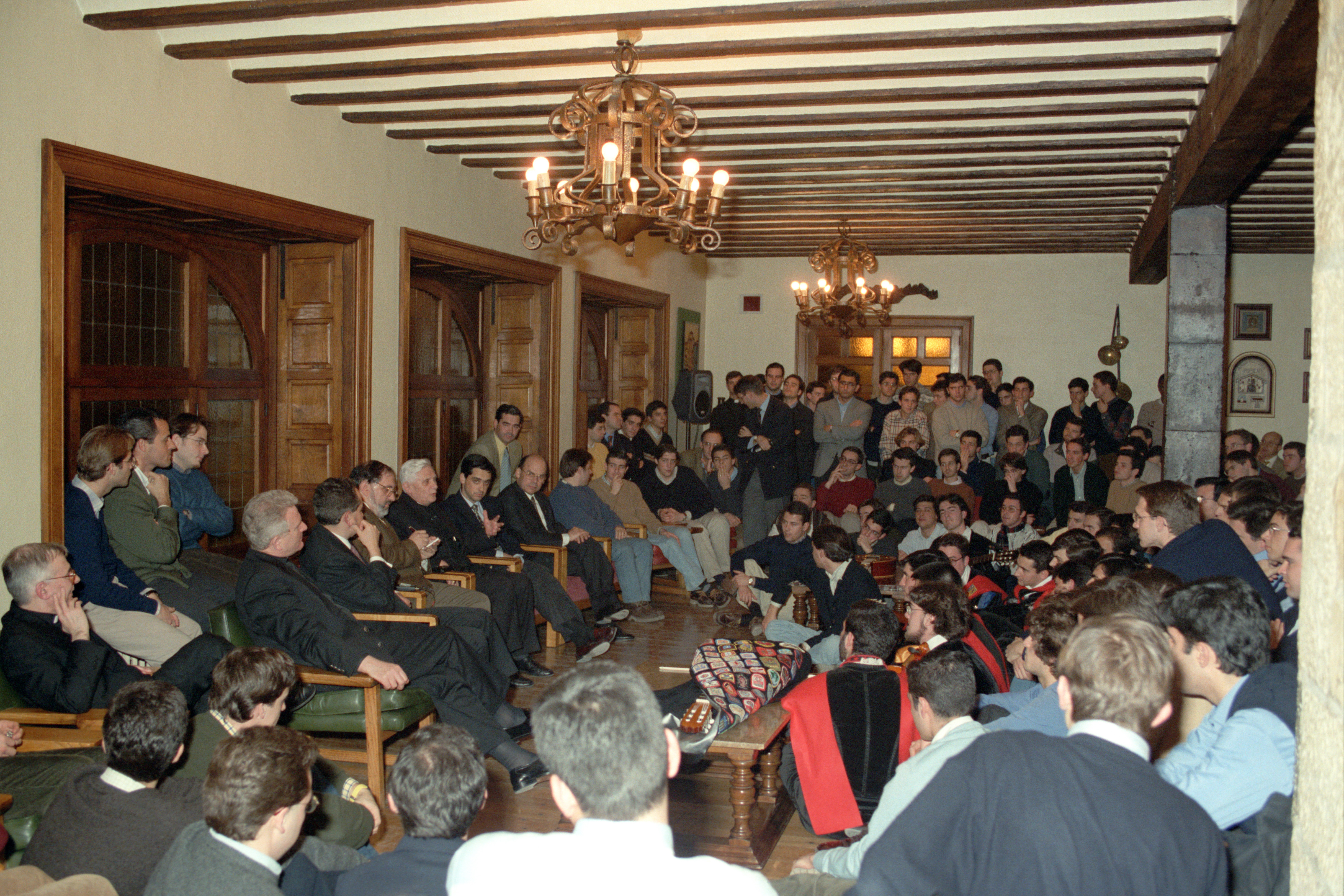 Así se puso de manifiesto la primera noche de su estancia en Pamplona. La tarde del día 40 había llegado cansado del largo viaje desde Roma. El primer ‘encuentro’ de esas jornadas tuvo lugar en el propio Colegio Mayor Belagua, que le hospedaba, con la tuna de la Universidad. “La gentil figura de la tradición”, “con su rumor de capas”, hizo olvidar a Joseph Ratzinger cansancios y retrasos en aeropuertos. Después de cenar, estuvo departiendo distendidamente con residentes en la sala de estar. En principio, después del ajetreo del viaje, iba a ser una sencilla toma de contacto. Las preguntas y las respuestas fueron prolongándose insensiblemente, con esa pérdida del sentido del paso del tiempo que acontece frecuentemente entre los universitarios cuando apasionan los temas de que se está hablando. El lector puede deducirlo de aquel coloquio espontáneo que se transcribe a continuación.